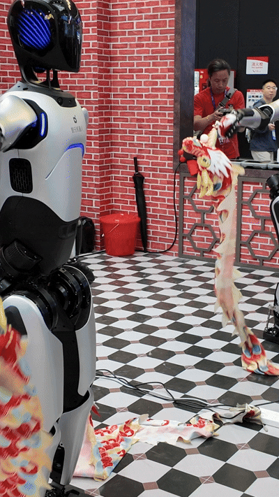 이어 Unitree Robotics의 휴머노이드 2대가 전통 용춤을 펼치며 부드러운 관절 제어와 협동 동작의 완성도를 보여줬고, 같은 부스에서는 로봇이 붓으로 한자를 쓰며 정교한 손목 회전과 압력 제어를 시연했습니다.