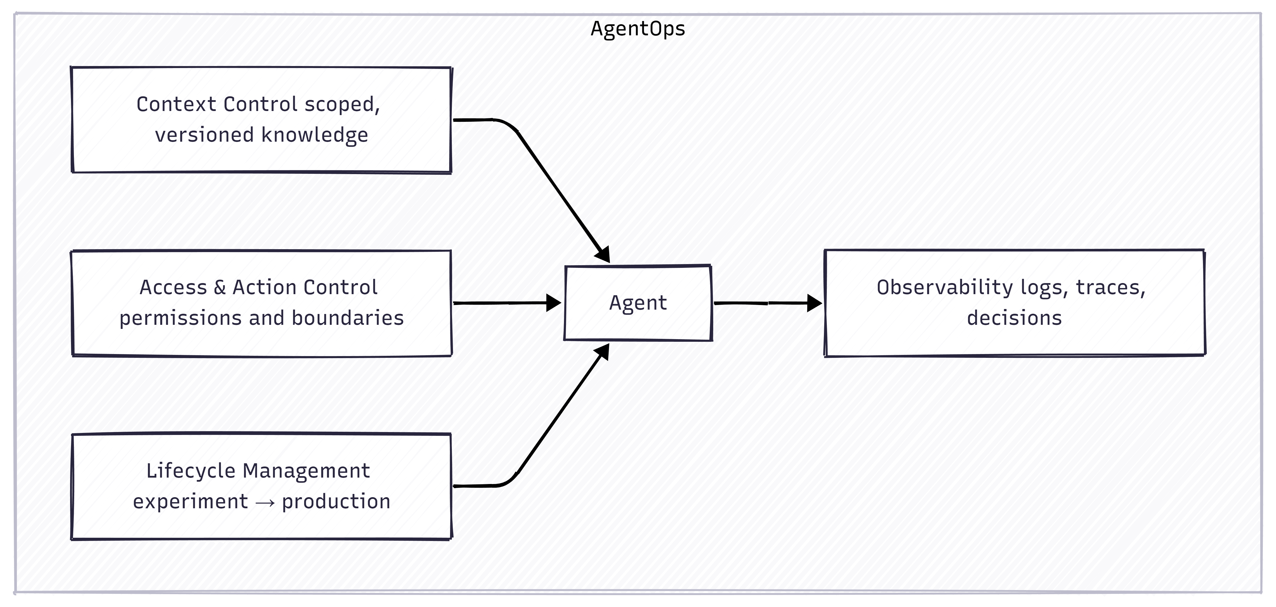 이를 추상적인 개념이 아니라 실무 관점에서 보면 AgentOps는 ‘똑똑한 에이전트’를 만드는 일과는 거리가 있습니다. 실제로는 에이전트를 둘러싼 일련의 규율과 운영 원칙에 가깝습니다. 에이전트는 거의 항상 명확한 역할을 부여받고, 제한된 데이터 소스와 허용된 행동 범위 안에서 동작합니다. 전체 코드베이스가 아니라, 버전 관리되고 검증 가능한 특정 맥락에서만 작업합니다.